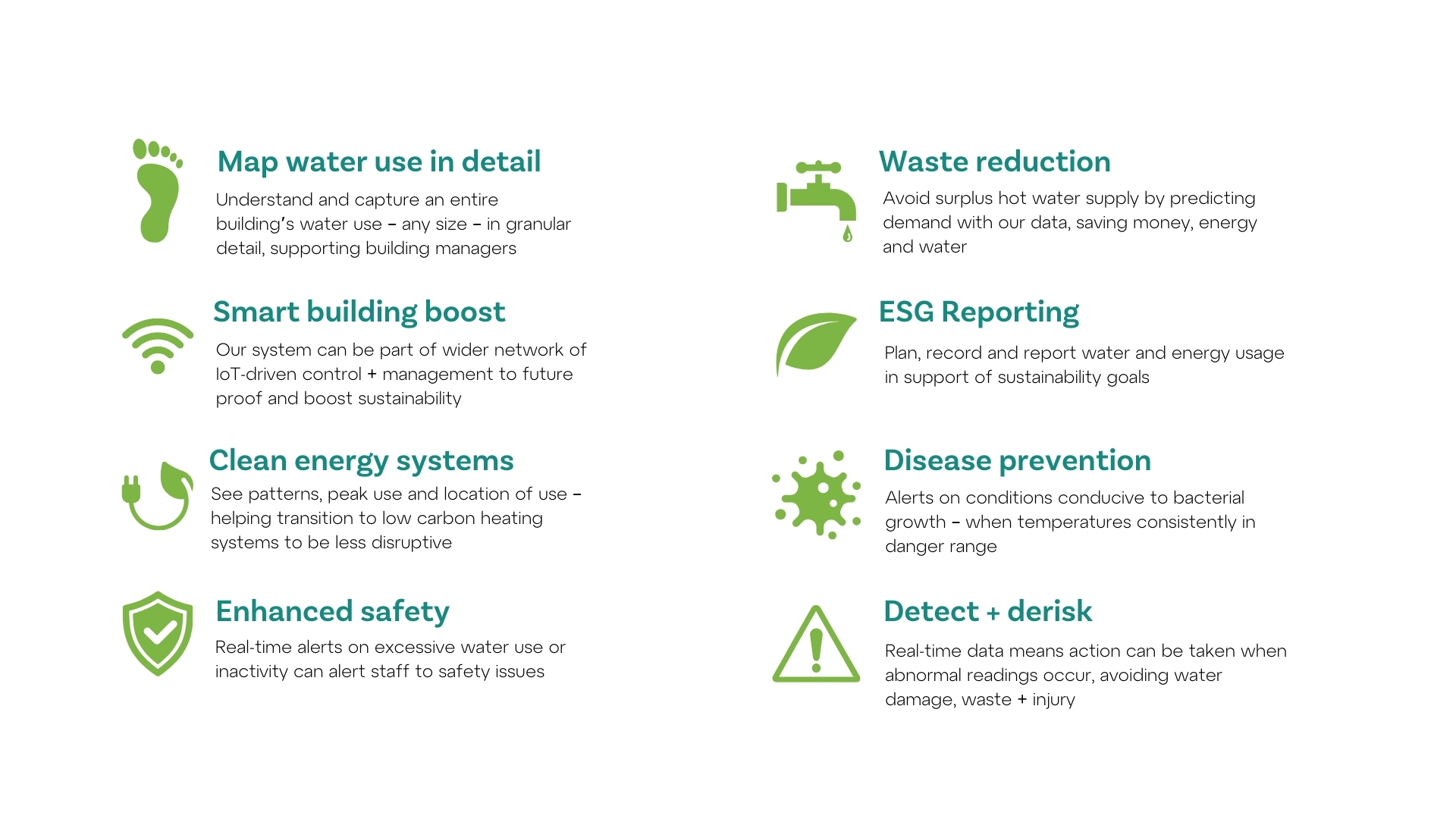 Our pioneering technical solution features small smart boxes, nestled in every room, which upload data from the flowmeters to a centralised cloud system and mobile app - remotely monitoring and managing water temperature and safety.